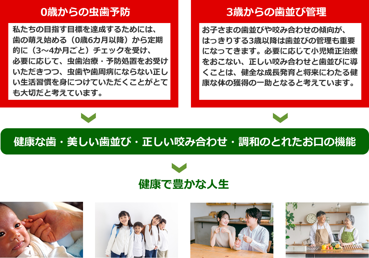 健康な歯と美しい歯並び、正しい咬み合わせを獲得することは、お子さまが将来に渡り健康で豊かな人生を歩む上で大変重要なことです。 健康な歯と美しい歯並び、正しい咬み合わせを獲得するためには、できるだけ低年齢からしっかりとした管理・治療が必要であり、それが私たちの役割だと考えています。